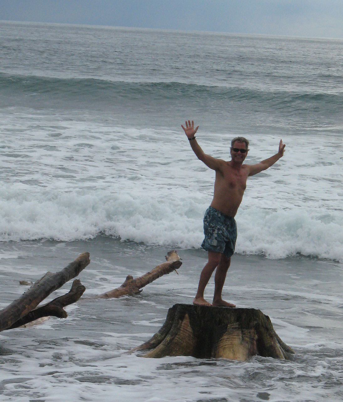 wood carved tree trunk tables and chairs – all out on the sand with the Pacific Ocean splashing in nearby. Almost everyone