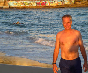 to walk up to Bondi Beach, a must-see surfing area where Jim took the plunge (75 degree water temp) so he could have